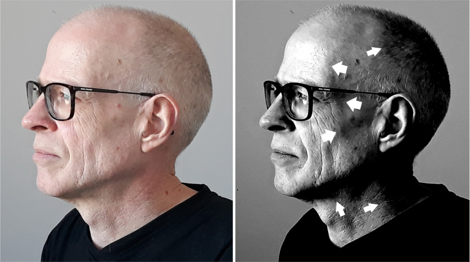 In het boek vertel ik je dat om de lijnen van een gezicht beter te kunnen zien je met een handigheidje zo ook makkelijker de verhoudingen te pakken hebt: het contrast vergroten.